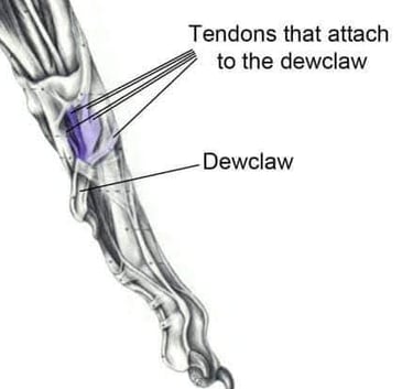 In standing, the front dewclaw may not appear to be functional because it doesn't come in contact with the ground. However, observing the dewclaw when the dog is in motion tells a different story. Five tendons attach to the dewclaw and play an important role when the dog is in motion. For example: