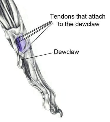 If a dog does not have dewclaws, there is a higher potential for the carpal ligaments to stretch and tear which could result in laxity and arthritis over time (OUCH!). This can then result in more stress being generated through the dog's carpus, elbow, shoulder, and spine as it tries to compensate for the lack of digit.